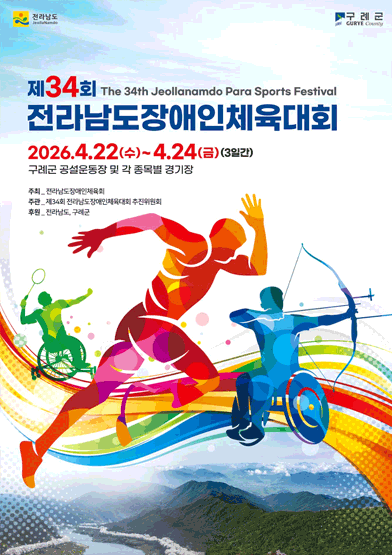 제34회 전라남도장애인체육대회 포스터는 ‘자연이 살아 숨 쉬는 생명의 도시 구례에서 행복한 전남체전’이라는 주제로 지리산과 섬진강을 배경으로 전남체전에 참여하는 선수들을 액티브한 그래픽으로 표현한 것으로 활기차고 에너지 넘치는 전남과 구례의 힘을 표현함.